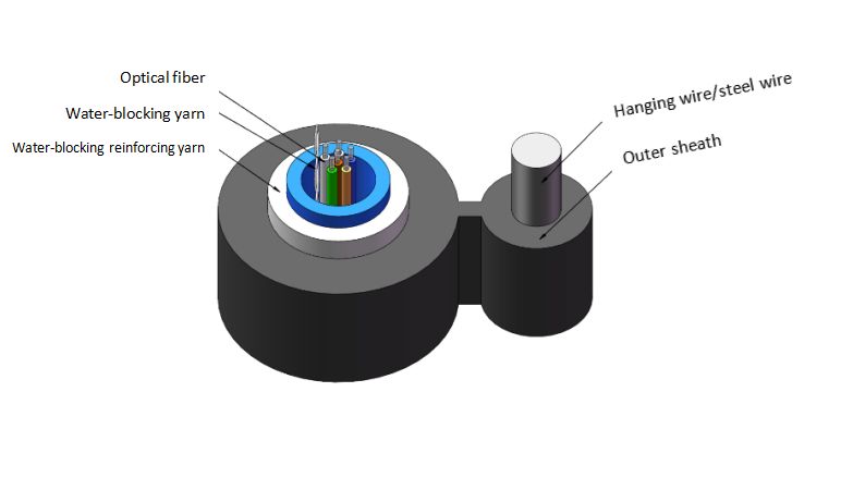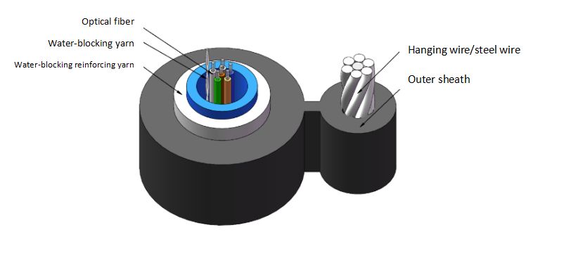 La estructura del cable óptico consiste en insertar fibras ópticas monomodo o multimodo en un tubo holgado hecho de plástico de alto módulo con hilo de bloqueo de agua de tipo completamente seco y relleno con material de bloqueo de agua, y colocarlo en el centro del cable. Alrededor del tubo holgado, se coloca hilo de refuerzo de bloqueo de agua (como hilo de vidrio, hilo de aramida y otros materiales de hilo no metálicos, etc.), y luego se extruye y envuelve una cubierta de polietileno (u otros plásticos o plásticos ignífugos, etc.). Al mismo tiempo, se agregan hebras de acero o alambres de acero redondos individuales para formar el cable.