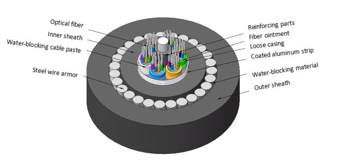 La estructura del cable óptico consiste en insertar fibras ópticas monomodo o multimodo en un tubo suelto lleno de un compuesto impermeable hecho de plástico de alto módulo.En el centro del núcleo del cable hay un componente de refuerzo de metalIncluye componentes de refuerzo de metal, tipo de relleno de capas sueltas, cubierta interna unida al polietileno de aluminio, blindaje de alambre de acero redondo fino,con una capa exterior de polietileno para la comunicaciónPara algunos núcleos de cables ópticos, una capa de acolchado de polietileno se extruye alrededor del elemento de refuerzo central de metal.Los tubos sueltos (y las cuerdas de llenado) se retorcen alrededor del elemento central de refuerzo para formar un núcleo de cable compacto y redondoLos huecos dentro del núcleo del cable se llenan con un compuesto que bloquea el agua, y una vaina interna de aluminio-polietileno unido se extruye.los huecos se llenan con un compuesto que bloquea el agua, y luego se extruye la cubierta exterior de polietileno para formar el cable.
